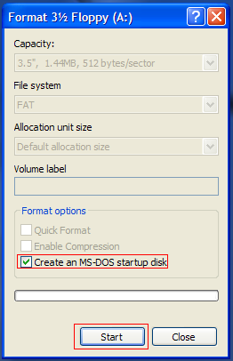 1) Make a MS-DOS bootable floppy "Start, My Computer, Right Click on floppy icon, format..."